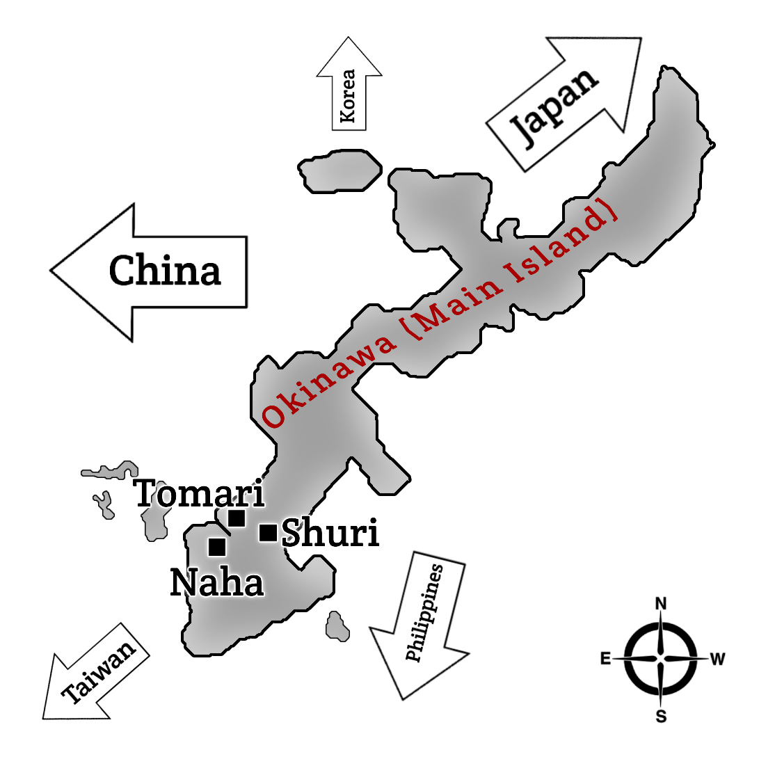 Okinawa (沖縄本島), or as it’s called in the native language of the islands, Uchinā, is the largest of a chain of Pacific islands. The island was important historically due to its value as a port halfway between China and the main Japanese islands. Okinawans used Karate as self-defense, and the art was later adapted as part of Japan’s cultural identity after WWII.