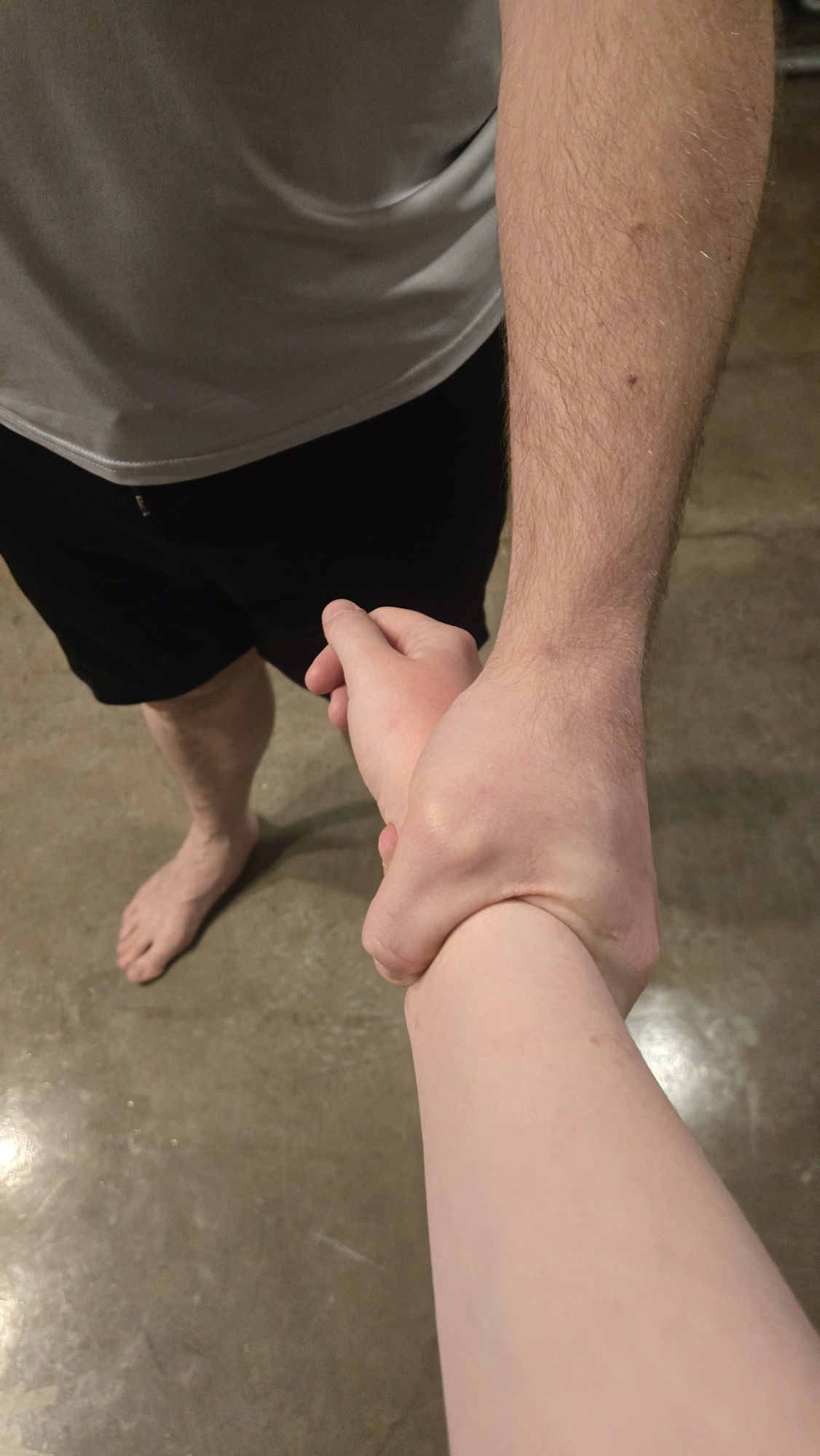 My wrist is grabbed, and I don’t like it. Maybe the attacker is trying to pull me somewhere; This technique is especially efficient for that.